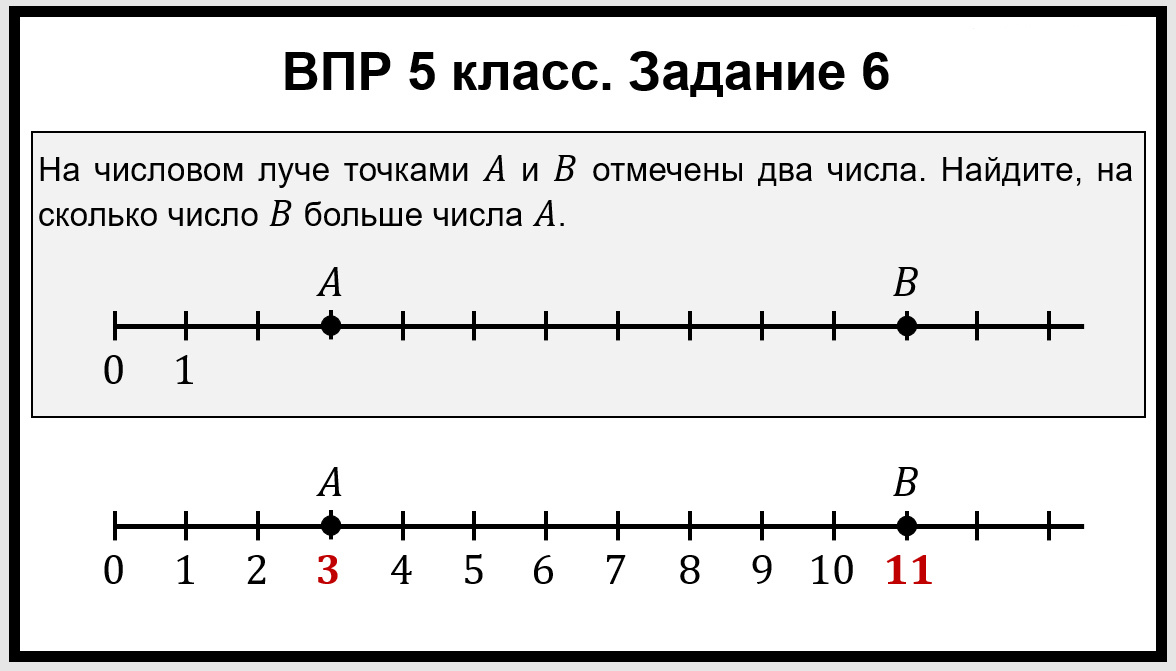 Разбор задания 6 ВПР по математике 5 класс. Учимся находить координаты точек на числовом луче и определять, на сколько одно число больше другого. Простой алгоритм для подготовки к ВПР. 📌 Условие: На числовом луче точками А и В отмечены два числа. Найдите, на сколько число В больше числа А. ✍ Решение 1. Находим координаты точек А и В По рисунку определяем: 2. Вспоминаем, как найти, на сколько одно число больше другого Чтобы узнать, на сколько число В больше числа А, нужно из большего вычесть меньшее: В − А. 3. Вычисляем разность В = 11, А = 3