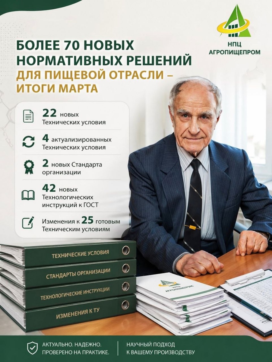 Уважаемые Производители! Обращаем Ваше внимание, НПЦ «Агропищепром» в марте 2026 года ввел в действие 22 новых Технических условия, 4 актуализированных Технических условия 2 новых Стандарта организации, 42 новых Технологических инструкций к ГОСТ Также специалисты НПЦ «Агропищепром» разработали изменения к 25 готовым Техническим условиям. НОВЫЕ ТЕХНИЧЕСКИЕ УСЛОВИЯ • ТУ,ТИ ГОВЯДИНА ЗАМОРОЖЕННАЯ (НДС 10%) • ТУ,ТИ КОЗЛЯТИНА ПАРНАЯ, ОСТЫВШАЯ ИЛИ ОХЛАЖДЕННАЯ (НДС 10%) • ТУ,ТИ ТЕЛЯТИНА ПАРНАЯ, ОСТЫВШАЯ ИЛИ ОХЛАЖДЕННАЯ • ТУ,ТИ ГОВЯДИНА ПАРНАЯ, ОСТЫВШАЯ ИЛИ ОХЛАЖДЕННАЯ (НДС 10%) • ТУ,ТИ ПОЛУФАБРИКАТЫ МЯСНЫЕ ИЗ ГОВЯДИНЫ, МРАМОРНОЙ ГОВЯДИНЫ, МЕЛКОКУСКОВЫЕ И ПОРЦИОННЫЕ ЗАМОРОЖЕННЫЕ [ПО NAMP] (НДС 10%) • ТУ,ТИ ПОЛУФАБРИКАТЫ МЯСНЫЕ КРУПНОКУСКОВЫЕ ИЗ ГОВЯДИНЫ, МРАМОРНОЙ ГОВЯДИНЫ, ЗАМОРОЖЕННЫЕ [ПО NAMP] (НДС 10%) • ТУ,ТИ ПОЛУФАБРИКАТЫ МЯСНЫЕ ИЗ ГОВЯДИНЫ, МРАМОРНОЙ ГОВЯДИНЫ, МЕЛКОКУСКОВЫЕ И ПОРЦИОННЫЕ ОХЛАЖДЕННЫЕ [ПО NAMP] (НДС 10%) • ТУ,ТИ ПОЛУФАБРИКАТЫ МЯСНЫЕ КРУПНОКУСКОВЫЕ ИЗ ГОВЯДИНЫ, МРА