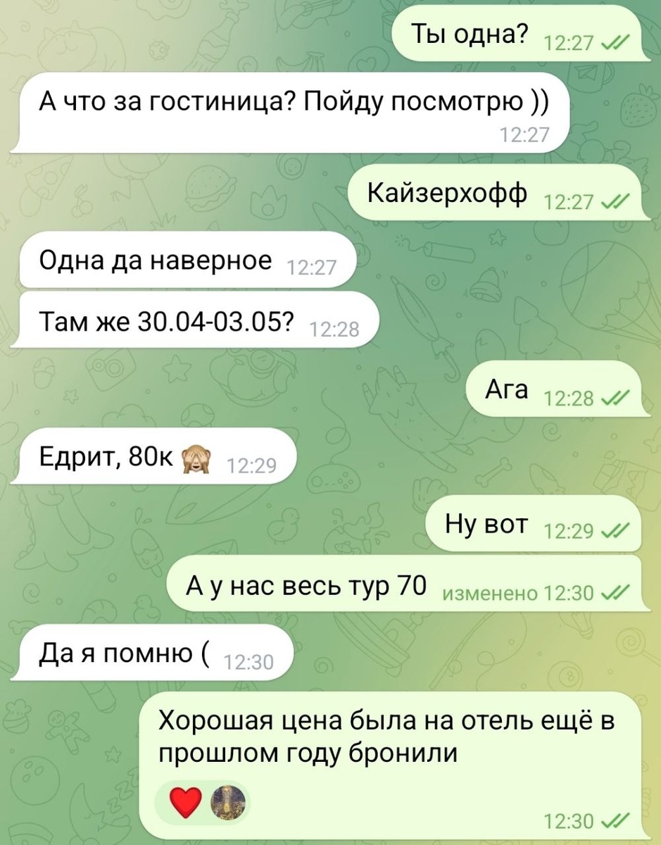 ?! И тут ничего кроме, а надо было раньше не скажешь. Честно сказала, чтобы избежать большого штрафа пришлось отказаться от последнего номера. Ну а дальше читайте переписку. Мы всё бронируем сильно заранее. Но что об этом уже говорить? Давайте просто сделаем выводы, и чтобы потом не было томительно больно, подумайте прямо сейчас про весенний Нежный Нижний Новгород. Билеты на Ласточку такая штука, сегодня они есть и вот уже их нет! Наш тур выходного дня станет отличным мостиком в лето! В мае там будет сказочно. И город хорош, и мы постарались! И мастер -класс, и экскурсия и даже спектакль в музее! Нереальное комбо на выходные! Нижний Новгород 16-17 мая https://dzen.ru/media/uletimru/vesennii-nejnyi-nijnii-novgorod-jdet-68987fd74ae95f6e4204ae79 Бронь только у меня 👇 @IrinaPolezhaeva Наш канал в MAXе