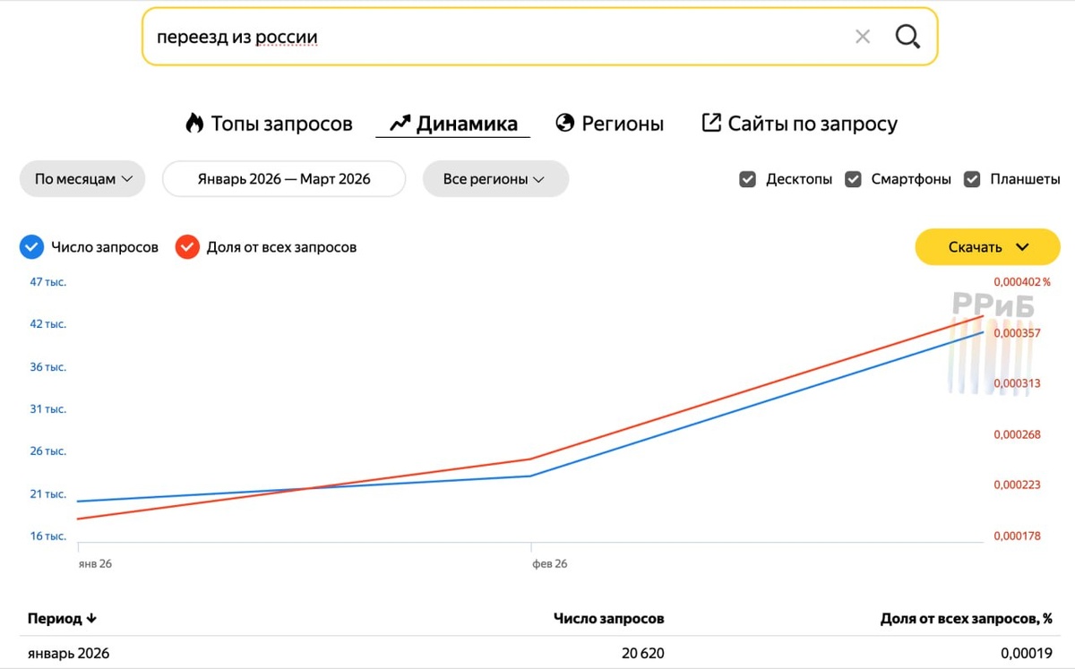 По данным «Яндекс Вордстат», если в январе таких запросов было 19,6 тысяч, то в феврале показатель вырос до 22,9 тысячи, а в марте — до 40 тысяч. Предыдущие два рекорда по запросам с формулировкой «переезд из России» пользователи поставили в 2022. При этом кардинально менять свой образ жизни россияне не хотят, отмечают аналитики. Большинство рассматривают переезд в соседнюю Белоруссию. Люди ищут плюсы и минусы, во сколько он обойдется, какие документы для этого нужны и особенности оформления на ПМЖ. Источник: Русский ритейл и бизнес Новости Кропоткина в MAX 📲 Предложить новость 👨💻 Все наши проекты 🥰