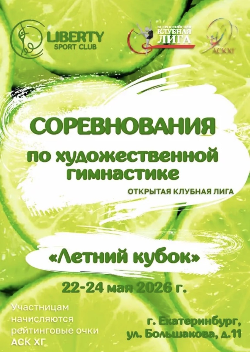 ⭐️ Сезон выходит на финишную прямую — 22–24 мая 2026 года в Екатеринбурге пройдет турнир «Летний кубок»🍀 👍Место проведения: Свердловская область, г. Екатеринбург. ул. Большакова, 11. МАУ СШ «Росток», ФОК «Октябрьский» 💡Соревнования проходят с начислением рейтинговых очков, которые влияют на позиции гимнасток в Клубной Лиге ✏️Судейская коллегия: Главный судья — Мурзина Светлана Валерьевна Главный секретарь — Дружинина Полина Михайловна 🌟«Летний кубок» — это финальные акценты весеннего сезона, где каждая оценка и каждое выступление имеют значение 🔗Подробности и положение – на сайте: https://rgclubsleague.com/schedule/letniy-kubok/