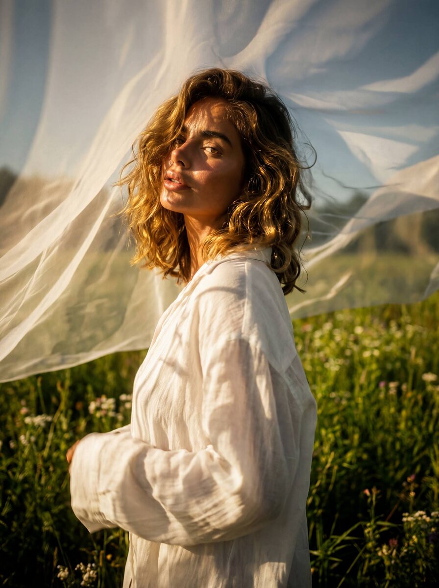 ✨ 1. Открываете любой сервис 2. Загружаете свою фотографию, чтобы лицо было хорошо видно 3. Вставляете этот промпт👇 Реальная fashion-фотосъёмка с драматичной наклонной композицией, съёмка снизу, несимметричный «крутой» ракурс, крупный план по полуфигуре. Девушка стоит в зелёном летнем поле, полном полевых цветов. Тёплый золотистый солнечный свет мягко проходит через белую полупрозрачную вуаль, создавая красивые пятнистые световые узоры и тени на лице, волосах и теле. Атмосфера ленивой, утончённой, поэтичной красоты. Волосы слегка растрёпаны и развеваются, золотистый блеск на прядях. На ней свободная белая рубашка, лёгкая и воздушная. Поза спокойная и расслабленная, она стоит рядом с развевающейся белой вуалью/занавеской. Свет мягко моделирует объём на волосах, коже и ткани, полупрозрачность вуали добавляет мечтательности и нежности кадру. Фон — бескрайнее зелёное поле с яркими полевыми цветами, трава и цветы вокруг ног. Общая стилистика — высококачественная editorial fashion photogr