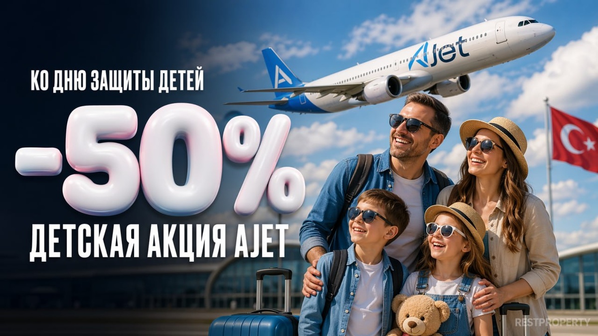 % Авиакомпания AJet объявила специальную кампанию в честь 23 апреля - Дня национального суверенитета и Дня защиты детей в Турции. 🎫 Главное предложение: Дети от 0 до 12 лет получат 50% скидку на все внутренние рейсы. 🗓 Период покупки билетов: • 22 апреля с 11:00 • до 23 апреля 23:59 (2026) 🛫 Период полётов: • с 14 сентября по 15 декабря 2026 года 💺 Скидка действует на все тарифы: Basic, Flex и Premium. 🖥 Купить билеты можно на сайте AJet.com и в мобильном приложении. Подписывайтесь на наш канал LifeinTurkeyRestProperty