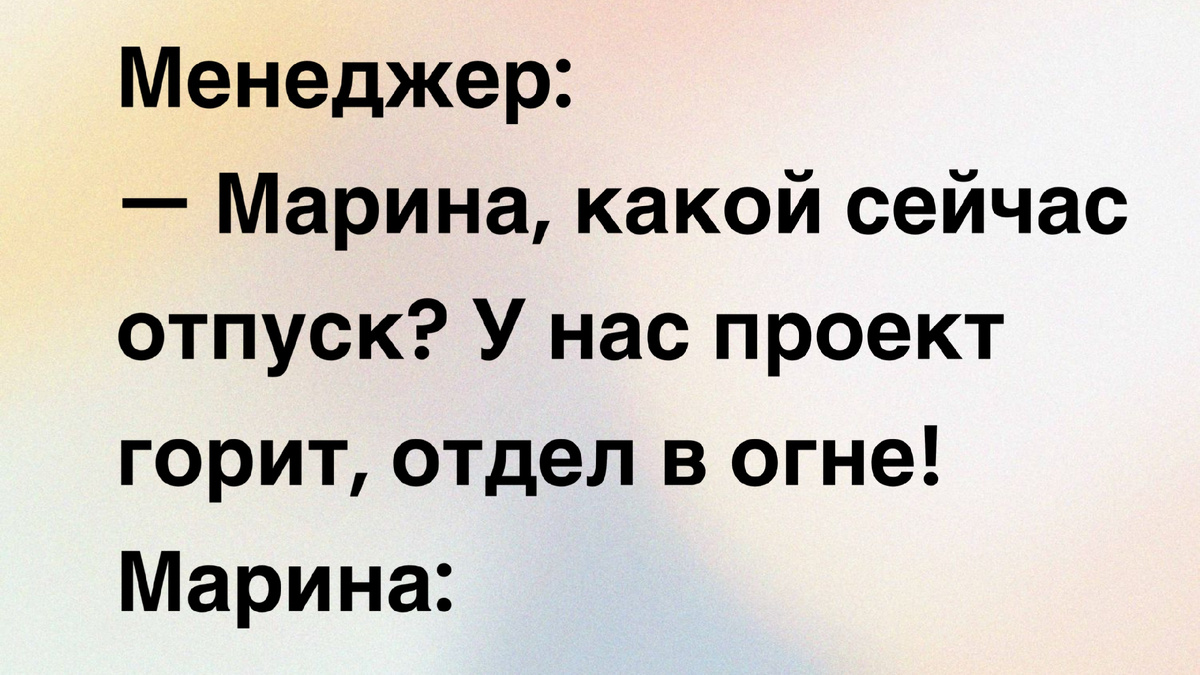 — Марина, какой сейчас отпуск? У нас проект горит, отдел в огне!
