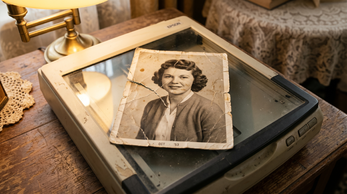 Сначала я аккуратно достала снимок из альбома. Альбом у нас бабушкин, кожаный, с золотым тиснением, пахнет ванилью и временем. Подложила фото на стекло сканера лицевой стороной вниз. Важно выставить высокое разрешение — не менее 600 dpi. Это как хорошая нитка для шитья: чем она качественнее, тем прочнее шов. Чем выше разрешение скана, тем больше деталей увидит программа и тем лучше будет результат.