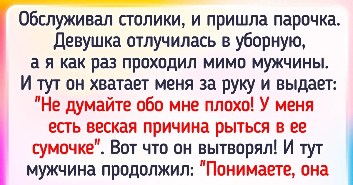 Обслуживал столики, и пришла парочка на свидание. Девушка отлучилась в уборную, а я в тот момент как раз проходил мимо мужчины. И тут он хватает меня за руку и выдает: «Не думайте обо мне плохо! У меня есть веская причина рыться в ее сумочке». И тут я заметил, что он вытворяет! А затем мужчина продолжил: «Понимаете, она назвала свое имя, но я его забыл!» Поэтому он искал ее бумажник, что посмотреть имя. Да уж.