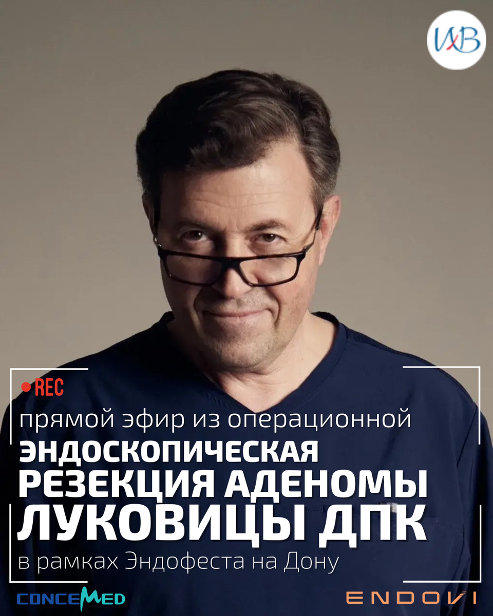 Завтра в 14:00 в Ростове-на-Дону состоится live-трансляция из операционной: эндоскопическое удаление эпителиального новообразования двенадцатиперстной кишки (аденома луковицы ДПК с дисплазией low grade). Оперирующие хирурги: 🔹 Юрий Геннадьевич Старков, член-корр. РАН, д.м.н., профессор, член Правления Российского общества хирургов, Российского общества эндоскопических хирургов, Российского эндоскопического общества, Ассоциации гепатопанкреатобилиарных хирургов СНГ, заместитель главного хирурга и эндоскописта Минздрава России, сопредседатель Профильной комиссии по эндоскопии Минздрава России, заведующий хирургическим эндоскопическим отделением НМИЦ хирургии им. А.В. Вишневского 🔹 Родион Дмитриевич Замолодчиков, старший научный сотрудник хирургического эндоскопического отделения НМИЦ хирургии им. А. В. Вишневского, хирург-эндоскопист, к.м.н., секретарь профильной комиссии по эндоскопии МЗРФ. 📍Учебно-лабораторный корпус РостГМУ (пер. Нахичеванский, 29, Ростов-на-Дону) Трансляцию также