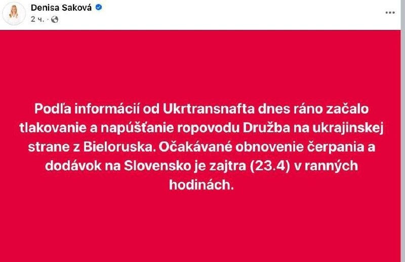 Украина начала перекачку нефти по трубопроводу «Дружба». Поставки в Словакию, как ожидается, возобновятся завтра, 23 апреля, — министр экономики Словакии Дениса Сакова