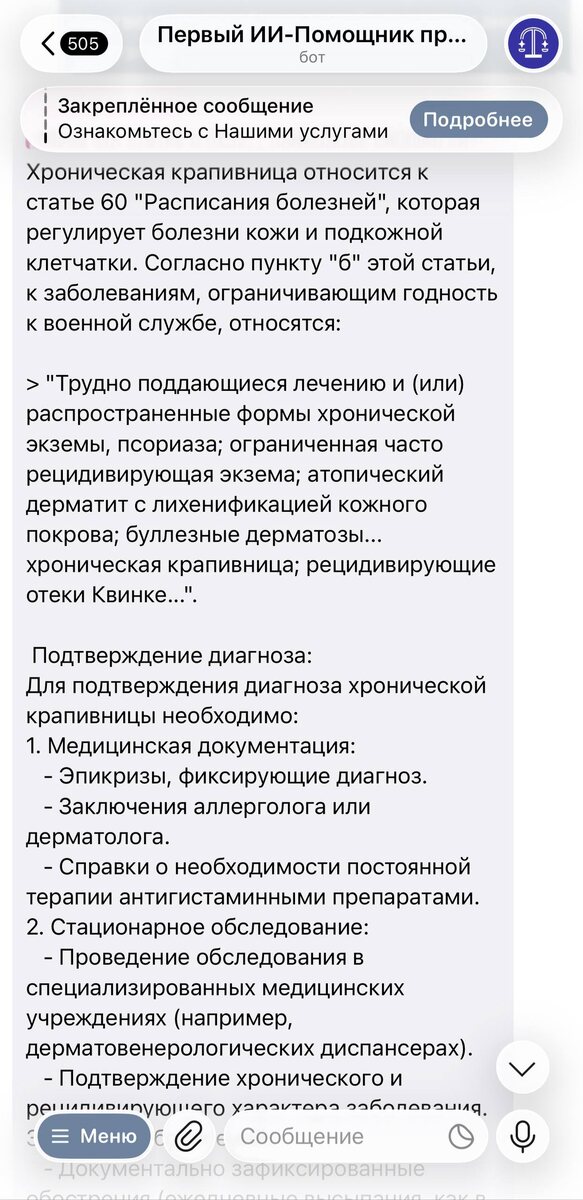 Вопрос: Здравствуйте, у сына хроническая крапивница,уже более 8 лет.Каждый день высыпание, каждый день принимаем антигистамини 1-2 штук.Эпикризы есть.Каждые 3-6 месяцев идём на прием к аллергологу .В октябре сыну будет 18 лет.В 16 лет на мед комиссии в военкомате дали категорию Г .Какая категория будет в 18 лет? Ответ прикрепляю ⬆️ @A_P_help_bot