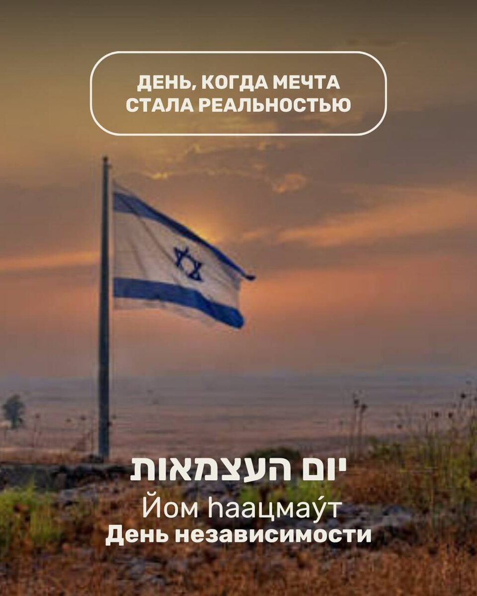 🇮🇱 Йом hаацмау́т День независимости День, когда мечта стала реальностью 14 мая 1948 года (5 ияра 5708 года по еврейскому календарю) Давид Бен-Гурион провозгласил создание Государства Израиль. А через несколько часов после провозглашения, Израиль атаковали армии пяти арабских стран. Но страна выстояла! Этот день - память о том, как маленький народ вернулся на свою землю после двух тысяч лет изгнания. И построил государство, которое сегодня стало домом для миллионов. В этот день в Израиле традиционно принято собираться с друзьями на шашлыки (לעשות על האש - лаасо́т аль haэ́ш). חג שמח! Хаг самеах! С праздником! 🇮🇱