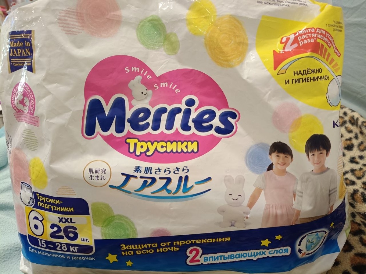 Отдам даром трусики-подгузники для подросших малышей размером XXL, на 15-28 кг., фирма Nerries (Япония), тонкие, дышащие, под одеждой не