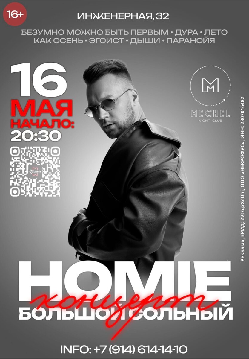 ! 16 мая Mechel Night Club посетит Homie — автор и исполнитель треков, которые ты знаешь наизусть: «Безумно можно быть первым», «Дура», «Лето как осень», «Эгоист», «Дыши», «Паранойя». Ранний вход+фото — 19:00 Открытие дверей — 19:45 Начало концерта — 20:30 info.reserve: +7 (914) 614-14-10 Билеты по ссылке: > КУПИТЬ БИЛЕТ < https://mechel.qtickets.ru/ Наши соц.сети: https://t.me/mechelnc Не пропусти. Будет громко!