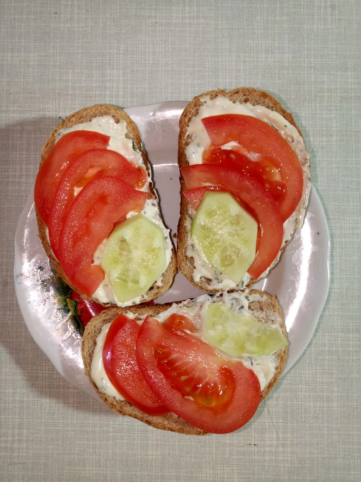 Доброго дня! Я б сегодня такие бутерброды назвала "Я тебя слепила из того что было"! Я не исключение, и это бывает у многих, всегда остаётся, один огурец свежий и один помидор свежий. Салат из этого не сделаешь (на семью мало, ну если только для себя делать). Но у меня семейство состоит из мужчин это муж и сын и даже есть кот (правда бутерброды он не ест))) Так вот, готовлю на вечер перекус, так же лёгкий и воздушный... Берём батон, майонез, чеснок, зелень по вкусу, помидор и огурец свежие. Погнали как обычно делать соус майонез + чеснок на тёрке + зелень у меня (это укроп). Размешали, и намазываем, обмазываем, замазываем этим всем батон... Огурец и помидор обязательно помыли! Кстати, уже писала, огурцы я мою, и всегда чищу от кожуры, не знаю почему, чищенные мне больше нравятся))) Так, та чём это я остановилась...? Ах, да, помыли огурчик и Помидорку, режем всё по своему желанию, кому как нравится и раскидываем на батон с нашим майонезом крутым... Вуаля... ГОТОВО!!! Реально, бутер