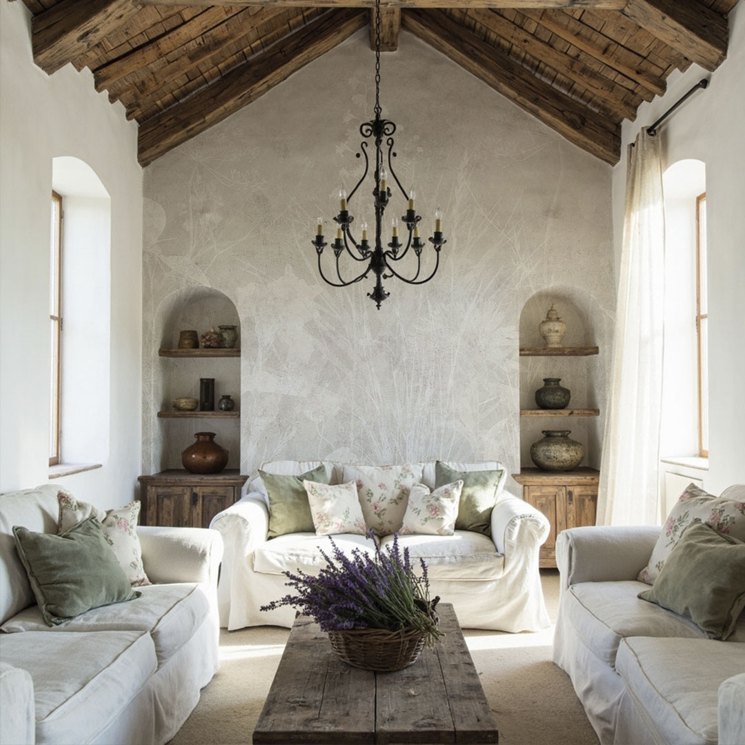 Для стен характерна некоторая небрежность в отделке, которая лишь подчеркивает их естественность. Краска наносится без идеального выравнивания, позволяя каждой трещинке напоминать о прожитых моментах. Альтернативой может стать использование обоев в стиле прованс с нежными цветочными узорами, пасторальными сценами или растительными орнаментами.