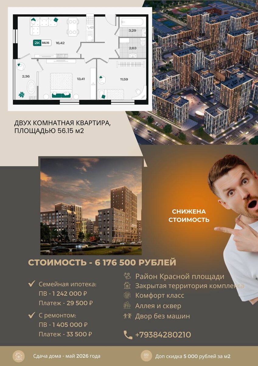 📍 Надо срочно брать ‼️ Последняя квартра Дом сдается в течении месяца. Ключи через пару месяцев. Стоимость всего 6 176 500 рублей в пред чистовой отделке и 7 019 000 рублей с отделкой «под ключ». Прекрасный вариант заехать в свою квартиру в ближайшее время. Расчет по семейной ипотеке. Стандартная ипотека от 16% без удорожания тоже можно. ☎️ +79384280210 Пишите в любой мессенджер. Оставьте заявку через наш бот @Brif11bot Подписаться | Консультация