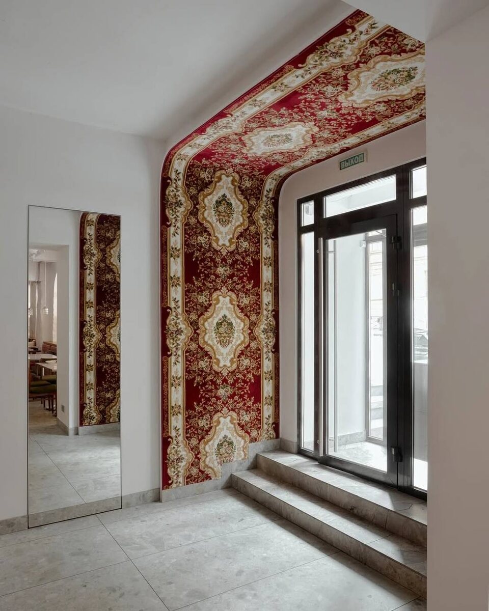 Ковёр заползает с пола на стену и ложится на потолок, превращаясь в арку-портал: идёшь к выходу — и проходишь сквозь него.