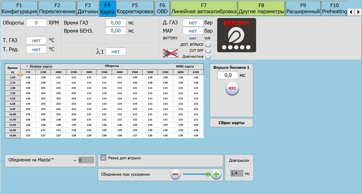 Настройка Lovato (Easy Fast, Smart, ExR) принципиально отличается от Digitronic. Если в Digitronic мы видим «кривые» (графики), то в Lovato — это цифровая таблица (матрица). Вот пошаговый алгоритм, как правильно с ней работать: 1. Автокалибровка — это «фундамент» Запускается на прогретом авто. Lovato в этот момент сама подбирает базовый коэффициент. Важно: В Lovato после автокалибровки все ячейки таблицы будут заполнены числами (например, 120, 130 и т.д.). Это не время впрыска, это относительные коэффициенты. 2. Главный принцип Lovato: «Метод переключений» В отличие от Digitronic, где мы смотрим на схождение линий, в Lovato настройка идет по ячейкам в реальном времени. Откройте вкладку «Карта» (Map). Вы увидите таблицу: по вертикали — обороты (RPM), по горизонтали — время впрыска бензина (нагрузка). На карте будет бегать синий квадрат (курсор) — он показывает, в какой ячейке двигатель работает прямо сейчас. Алгоритм настройки ячейки: Удерживайте педаль газа в одном положении (например,