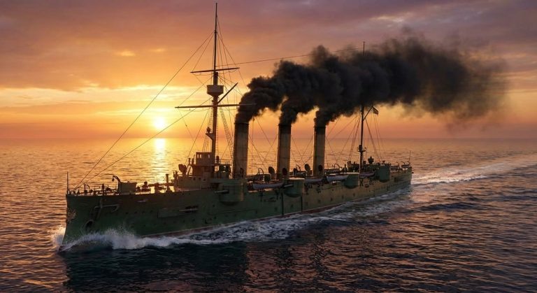 Данная статья выкладывается от имени автора без его ведома (ссылка будет в конце статьи). А вот иллюстраций я добавил – сделанный при помощи ИИ Нано-банана. Котлы и машины здесь пока оставлены, как и задумывалось изначально, от «Рюрика» (в уполторённом числе) и от «России» соответственно. Извиняйте, коллеги, не хватило меня уже на придумывание для нее новой КМУ. При этом помимо силовой установки решено было поизмываться и над артиллерией альт-корабля. А итоговый результат всех корабельно-вивисекционных «варварств и зверств» лучше всего оценить в наборе ее предполагаемых ТТХ: по проекту – нормальное водоизмещение 12500 тонн, 473 фута или 144,17 м (длина по ВЛ)/485 футов или 147,83 м (длина наибольшая)/69 футов или 21,03 м (ширина наибольшая)/26 футов или 7,92 м (осадка при нормальном водоизмещении), 1250/2250 т угля (нормальный/полный запас), 24 огнетрубных котла, мощность машин 21000 л.с. (3 машины), скорость 21,5 узла, броня Гарвея и сталеникелевая, полный пояс по ВЛ (8 футов и 6 дюй