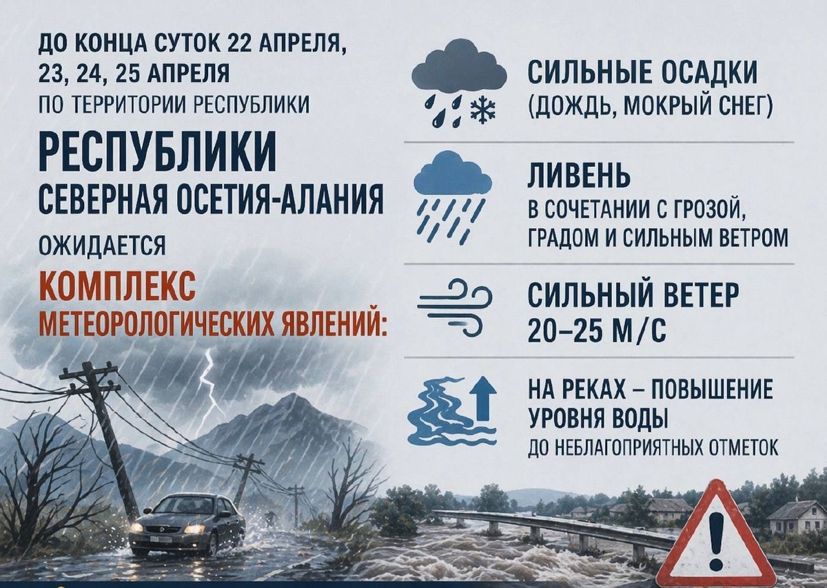 До конца суток 22 апреля, 23, 24, 25 апреля по территории РСО-Алания ожидается комплекс метеорологических явлений: сильные осадки (дождь, мокрый снег) ливень в сочетании с грозой, градом и сильным ветром 20-25 м/с, на реках повышение уровня воды до неблагоприятных отметок, в связи с чем существует риск возникновения ЧС.