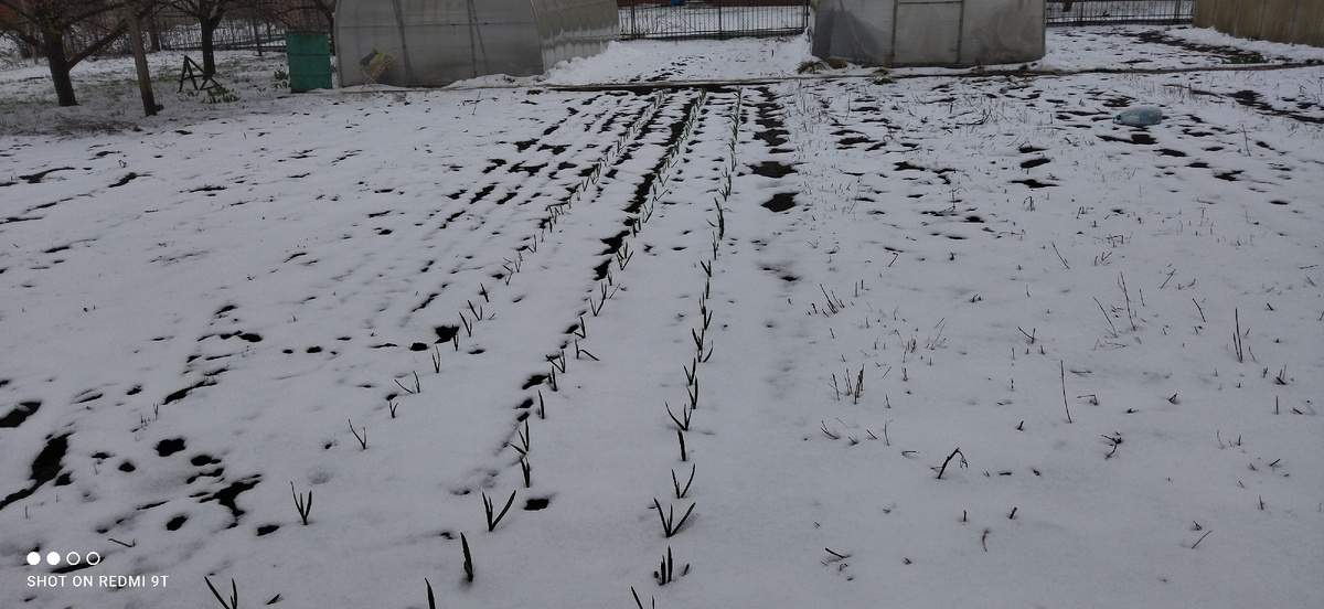 Зима ,конечно, нынче испытывала нас! Снега было столько! Снег быстро растаял! И чеснок уже из под снега виден был щёткой! Но к сожалению никакой уход пока не можем проводить! Очень сыро! А надо бы!