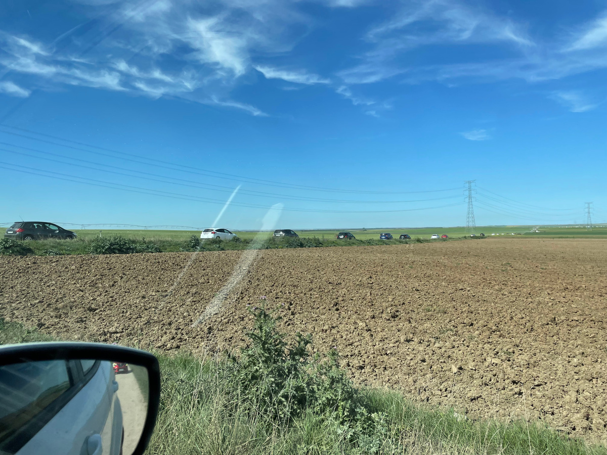 Наконец, измучившись в этой вялоползущей пробке, мы добрались до импровизированной парковки. Организована она была в чистом поле и тоже поражала размерами. Сколько тысяч тонн кукурузы или ячменя недополучили испанские фермеры, не распахав это поле, осталось за кадром истории.