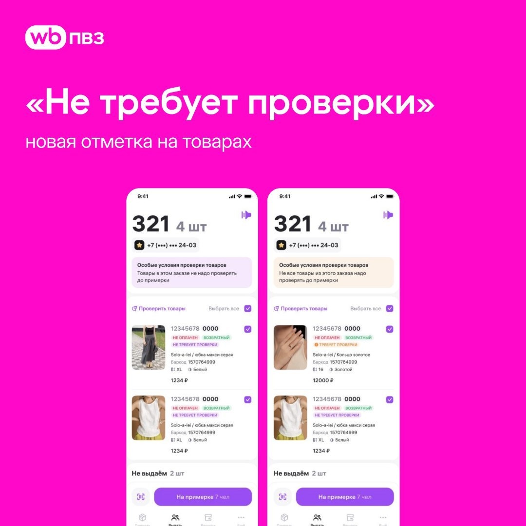 🔽🔽🔽 🪅 Новая отметка «Не требует проверки» на товарах — что она означает Эта отметка появилась из-за новой возможности «Простой возврат» для покупателей — они смогут отказаться от товара после примерки и без одобренной заявки, даже если ПВЗ найдёт дефект. А возврат из дома для таких клиентов пройдёт по упрощённому процессу. В рамках тестового периода на некоторых товарах вы будете видеть отметку «Не требует проверки». Это значит, что клиенту не обязательно проверять этот товар под камерой перед примеркой или выкупом. Примите такой товар — мы не начислим удержание, даже если вы приняли товар с недостатком или подменой. Главное, поставьте нужную отметку и принимайте возвраты и отказы по правилам, которые мы прописали ниже. Если тестовый период покажет положительные изменения в процессах пунктов выдачи, «Простой возврат» будет доступен остальной части покупателей. Как принять возврат из дома с отметкой «Проверить только на подмену» Это значит, что клиент может вернуть возвратный