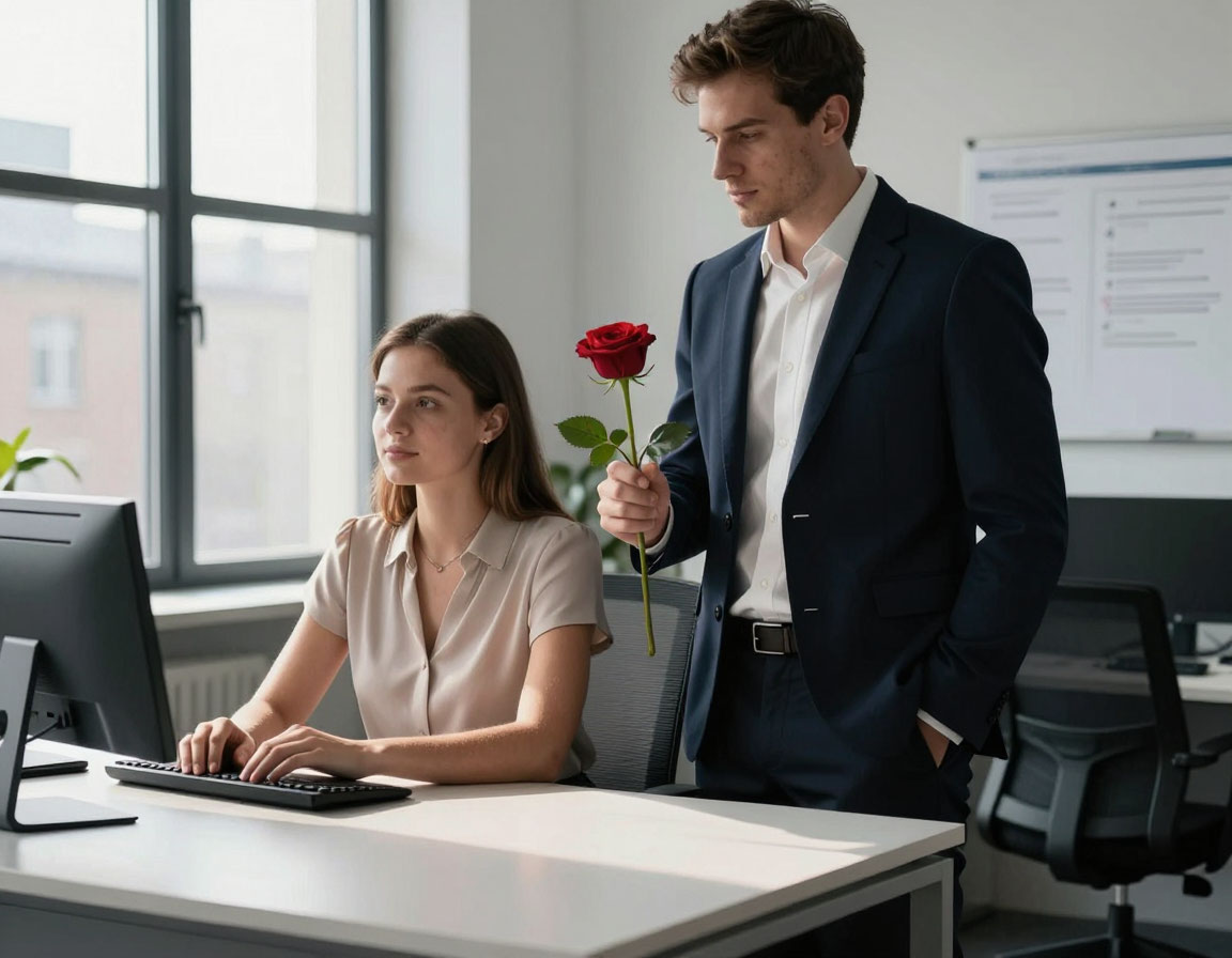 Потом начались попытки ухаживания. Первые шаги Марата были наивными, почти детскими. Однажды он подошёл к её столу с одинокой розовой розой.