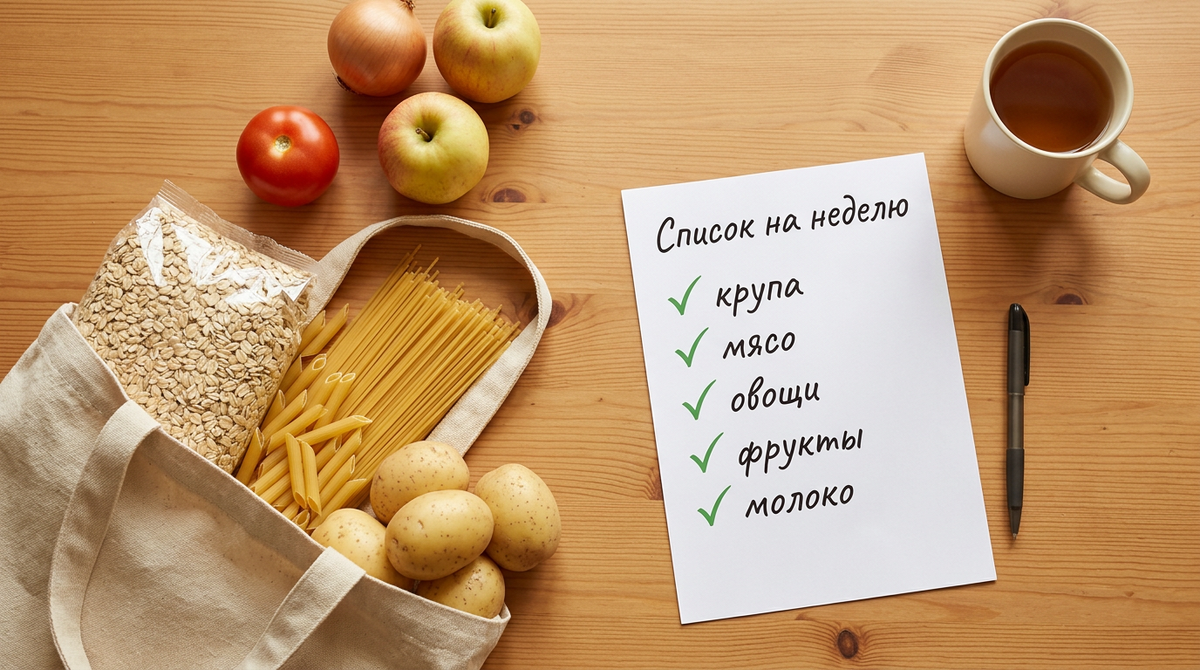 Есть ощущение, что на еду уходит слишком много, но «закручивать гайки» страшно — кажется, что сразу станет бедно и голодно? При этом холодильник вроде полный, мусорное ведро тоже не пустует, а в кошельке всё равно минус. Давайте соберём спокойную, рабочую схему на неделю: без «гречки и воды», без трёхчасовых заготовок, но с понятным планом, который экономит деньги и силы. Экономия на продуктах начинается не с купонов и скидок, а с честного ответа: где вы платите за хаос, а не за еду. Чаще всего лишние траты прячутся в трёх местах: Перед тем как «экономить», загляните в холодильник и шкаф с крупами и честно спросите: что мы купили уже два‑три раза, потому что не видели старое? Многих пугает словосочетание «недельное меню», потому что в голове картинка из идеального инстаграма. На самом деле достаточно базового скелета: Например: Важно не придумать «идеальное меню», а решить: какие продукты нам точно понадобятся и в каком примерно объёме. Теперь — ключевой момент: список пишется по меню,