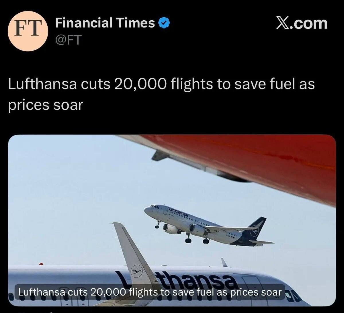 Немецкая Lufthansa отменит 20000 перелетов из-за нехватки авиатоплива, сообщает The Financial Times
