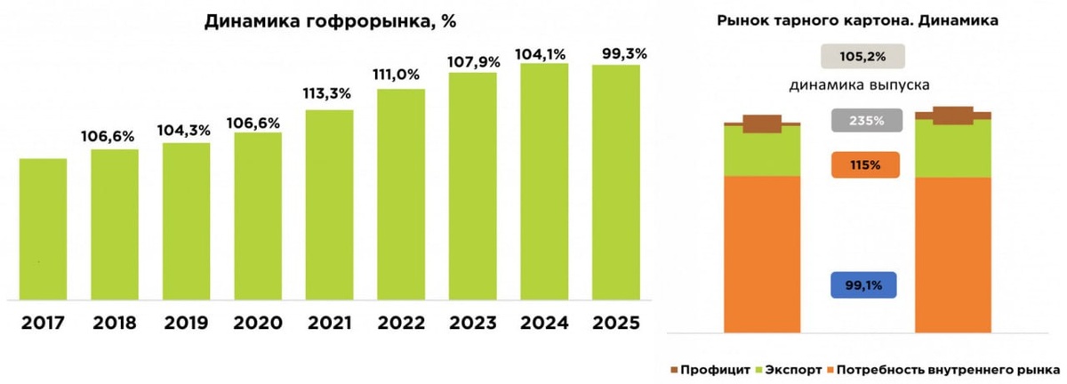 Рынок тарного картона в РФ: адаптация к новым условиям. Итоги 2025. Прогноз 2026 Российский рынок тарного картона в 2025 году: структурный перелом и профицит макулатурных видов. По итогам 2025 года российский рынок тарного картона впервые столкнулся с устойчивым профицитом сырья. При этом характер дисбаланса неоднороден: сегмент целлюлозного картона остаётся сбалансированным за счёт активного экспорта, тогда как рынок макулатурных видов вошёл в зону избыточного предложения. Макроэкономический фон Темпы роста российской экономики замедлились: ВВП прибавил 1,0% после 4,9% годом ранее. Оборот розничной торговли снизился до 2,6% (с 7,7% в 2024-м), а пищевая промышленность впервые за несколько лет показала отрицательную динамику (–0,5%). Ключевая ставка ЦБ в среднем составляла 19,2%, что сдерживало инвестиционную активность и покупательский спрос. Рынок гофроупаковки — основной потребитель тарного картона — впервые за десять лет сократился (–0,7%). Производство растёт, спрос падает В