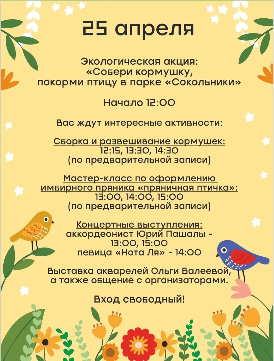 Акция "Собери кормушку, покорми птицу в парке "Сокольники" состоится 25.04 с 12:00