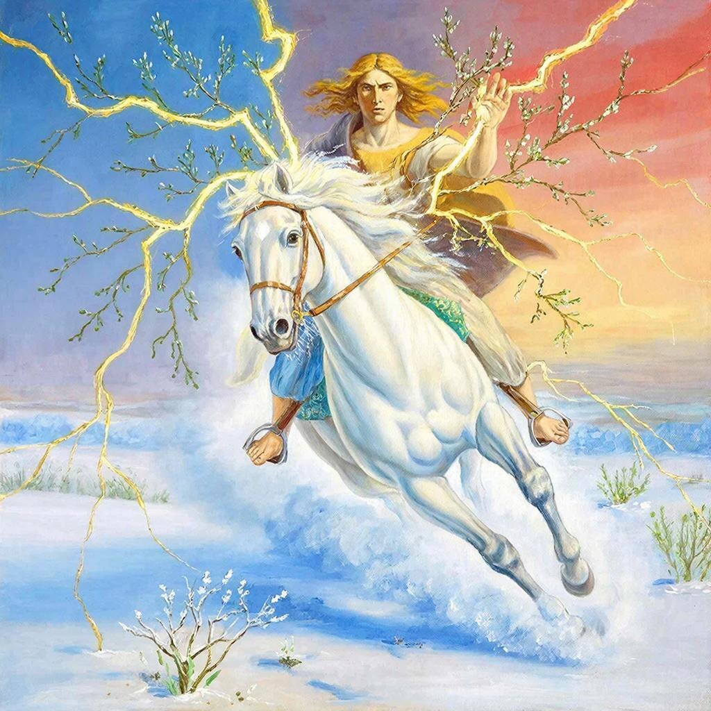 Ярило предстает в образе молодого прекрасного всадника на белом коне, с золотыми, развевающимися на ветру волосами, в сияющих белых одеждах. Он бос, словно сама пробужденная земля, по которой он ступает. Но самый важный эзотерический ключ к его образу — это предметы в его руках.