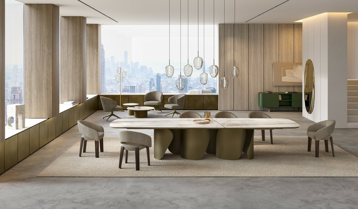 Бренд Riflessi из региона Абруццо представил новую линейку эстрабольших столов со слоганом «Элегантность становится великой». Столы Enea. Shangai, Living, Onda и Tower составляют коллекцию, объединяющую столы внушительных размеров в изысканном выверенном стиле, созданных быть статусными объектами интерьера. Благодаря двойному основанию столешница состыкована из двух слэбов. Экстрабольшие столы производят сильное визуальное воздействие, в том числе и за счет натуралистичного рисунка структур, характерных для натурального мрамора, театрально торжественных в своей текучести и великолепной цветовой гармонии.