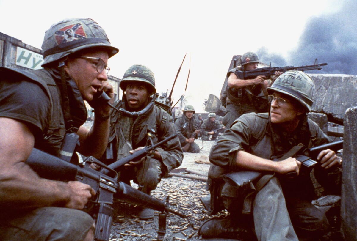 Фильм Стэнли Кубрика «Цельнометаллическая оболочка» устроен так, что представляет собой два совершенно разных фильма, искусно соединённых в одну картину, и этот приём позволяет глубже раскрыть, как именно армия ломает и перестраивает человека. Первая половина полностью посвящена базовой подготовке морской пехоты и становится почти самостоятельной, жёсткой драмой о том, как обычных людей превращают в солдат. Мы следим за новобранцем Джей Ти, которого играет Мэттью Модайн: он остроумный, ироничный парень, который пытается сохранить хотя бы часть своей личности под давлением системы. Его инструктор, старший сержант Хартман в исполнении Р. Ли Эрми, — это воплощение абсолютной военной машины, человек, который не просто учит, а методично уничтожает всё человеческое в подчинённых через бесконечные унижения, крики, физические нагрузки и психологическое давление. Особенно ярко на этом фоне выделяется Леонард Лоуренс, сыгранный Винсентом Д’Онофрио: неуклюжий, полный, медлительный парень, которого Хартман выбирает главной мишенью. Издевательства над ним нарастают день ото дня, пока не доводят до полного нервного срыва. Его ключевая сцена становится настоящим эмоциональным взрывом первой части: она показывает, как подготовка, которая должна закалять, на самом деле калечит психику, превращая слабость в ярость, а человека — в угрозу для окружающих и для самого себя. Затем повествование резко обрывается и переносит зрителя на несколько лет вперёд, во Вьетнам. Шутник теперь сержант, он работает в военной газете, пишет статьи, которые должны поддерживать боевой дух, но сам ещё не видел настоящего боя. После атаки на базу его наконец отправляют на передовую, и здесь фильм полностью меняет ритм, стиль и настроение. Он превращается в классический военный фильм, полный грязи, хаоса и внезапных потерь: Шутник вместе с товарищами пробирается через разрушенные города, участвует в зачистках, выслеживает вражеского снайпера и теряет своих напарников. Сцены боевых действий сняты с пугающей реалистичностью — здесь нет героического пафоса, только страх, усталость, случайная жестокость и ощущение полной бессмысленности происходящего. Этот структурный разлом — не просто приём для удобства повествования. Кубрик специально разделяет картину на две части, чтобы показать, как подготовка, пройденная в первой половине, работает на войне. С одной стороны, она действительно спасает: солдаты, прошедшие через ад Хартмана, умеют подчиняться, быстро реагировать, не раскисать и выполнять приказы даже в самых страшных условиях. Шутник выживает именно благодаря тем рефлексам и той внутренней жёсткости, которые ему вбили во время тренировок. С другой стороны, подготовка не может защитить от главного — от ужаса реальной войны, от того, что человек, которого ты только что знал, вдруг превращается в ничто, от постоянного ощущения, что твоя жизнь ничего не стоит.