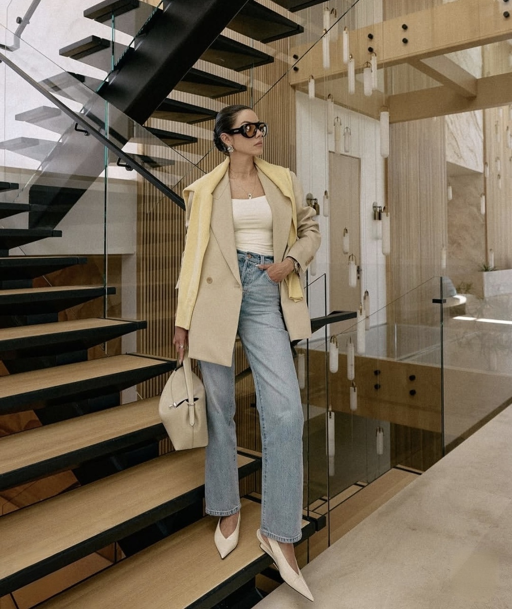 Главное – посадка. Выбирайте полную длину, плотный деним и высокую или среднюю линию талии. И очень важный момент: джинсы не должны обтягивать. Между вами и тканью должен быть воздух – лёгкая свобода, за счёт которой образ выглядит современно.