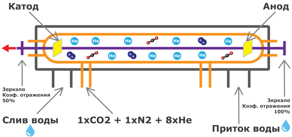 Резонатор состоит из стеклянной колбы (отмечена рыжим) и двух зеркал. У одного коэффициент отражения 100% (на практике 98%), у другого — 50%.