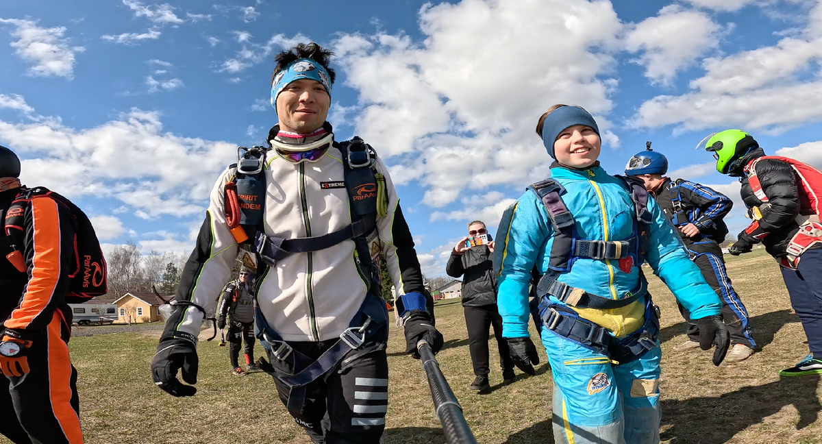 ✈ Соня. Прилетела из Воронежа с молодым человеком. Ребята просто пили чай с печеньем, а через час уже надевали подвесные системы. Решили прыгнуть в тандеме спонтанно и успели за день до вылета домой. Вот это я понимаю — жажда жизни!