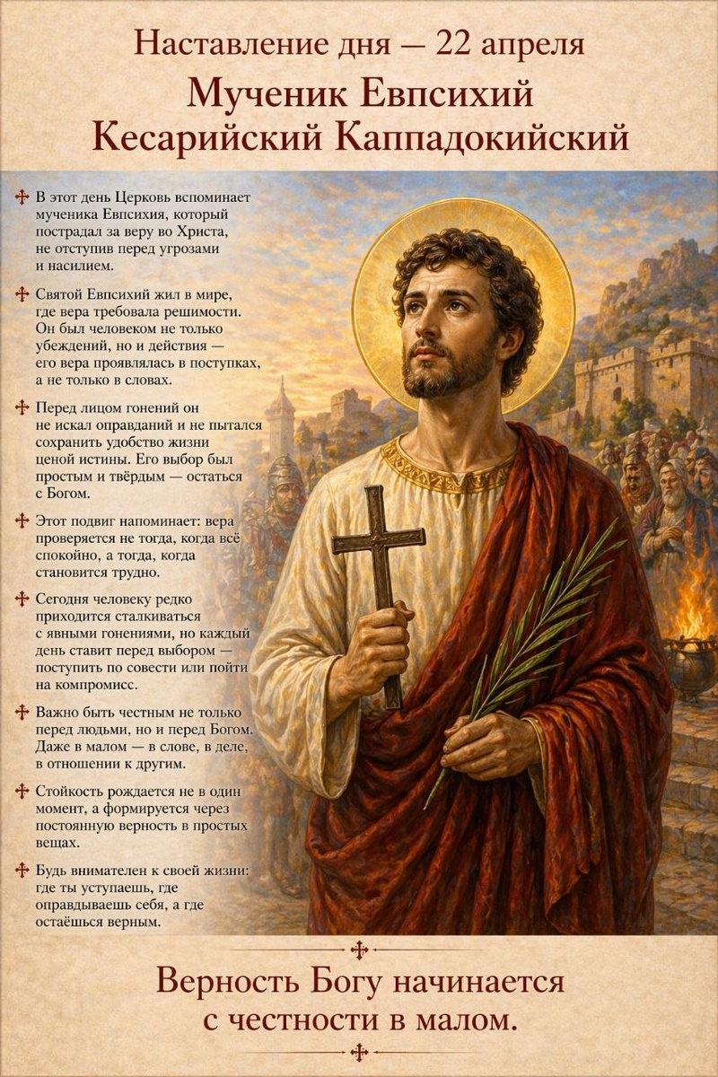 Мученик Евпсихий Кесарийский Каппадокийский В этот день Церковь вспоминает мученика Евпсихия, который пострадал за веру во Христа, не отступив перед угрозами и насилием. Святой Евпсихий жил в мире, где вера требовала решимости. Он был человеком не только убеждений, но и действия — его вера проявлялась в поступках, а не только в словах. Перед лицом гонений он не искал оправданий и не пытался сохранить удобство жизни ценой истины. Его выбор был простым и твёрдым — остаться с Богом. Этот подвиг напоминает: вера проверяется не тогда, когда всё спокойно, а тогда, когда становится трудно. Сегодня человеку редко приходится сталкиваться с явными гонениями, но каждый день ставит перед выбором — поступить по совести или пойти на компромисс. Важно быть честным не только перед людьми, но и перед Богом. Даже в малом — в слове, в деле, в отношении к другим. Стойкость рождается не в один момент, а формируется через постоянную верность в простых вещах. Будь внимателен к своей жизни: где ты уст