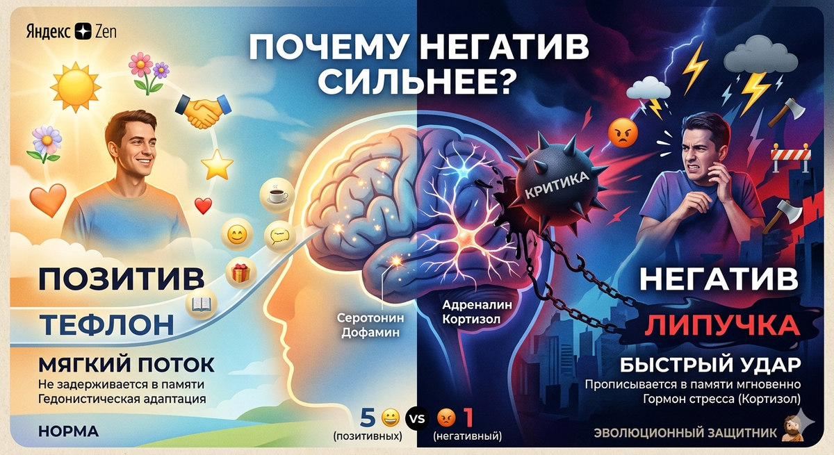 Обычный парадокс. Представьте: за день вам сказали девять комплиментов и один раз нахамили в очереди. Что вы будете прокручивать в голове перед сном? Скорее всего, то самое хамство. Наше сознание работает странно: мы можем годами помнить обидную шутку одноклассника, но забыть искреннюю похвалу, сказанную вчера.