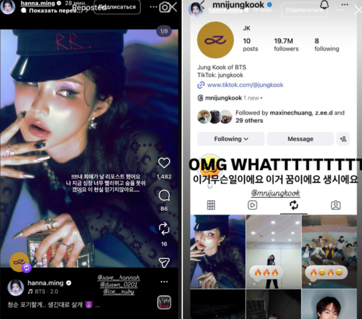 Чонгук сделал репост поста обладательницы титула «Мисс Корея 2022» Ханны Мин, использовав песню «BTS 2.0».