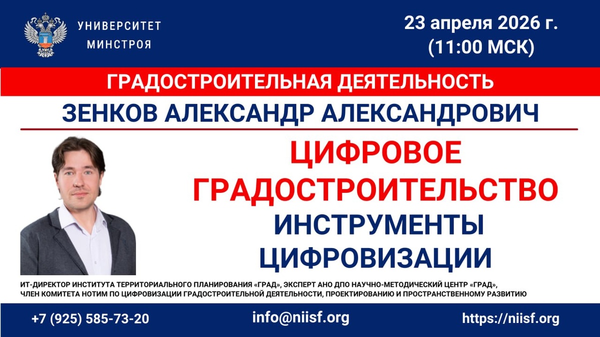 🗓 Уже завтра, 23 апреля, с 11:00 до 12:30 (Мск) Университет Минстроя НИИСФ РААСН проведёт бесплатный вебинар «Цифровое градостроительство: инструменты цифровизации» 📹 Участие в прямом эфире бесплатное. Ссылка на подключение появится за 15 минут до начала в группе Университета Минстроя в MAX. Основная трансляция пройдёт в МТС Линк 🎤 Проведёт вебинар Александр Зенков — ИТ-директор Института территориального планирования «Град», член комитета НОТИМ по цифровизации градостроительной деятельности, проектированию и пространственному развитию 💬 На вебинаре разберём: 🔵 Как выстроить цифровое градостроительство без хаоса; 🔵 цифровые документы территориального планирования, ПЗЗ и ППТ; 🔵 цифровые нормативы и применение ИИ; 🔵 интерактивные карты, сервисы участия жителей и инструменты контроля 🎯 Подключайтесь 23 апреля, чтобы разобраться в теме без лишней теории и понять, как применять цифровые инструменты в градостроительстве на практике 🔎 Если хотите глубже изучить тему, обратите в