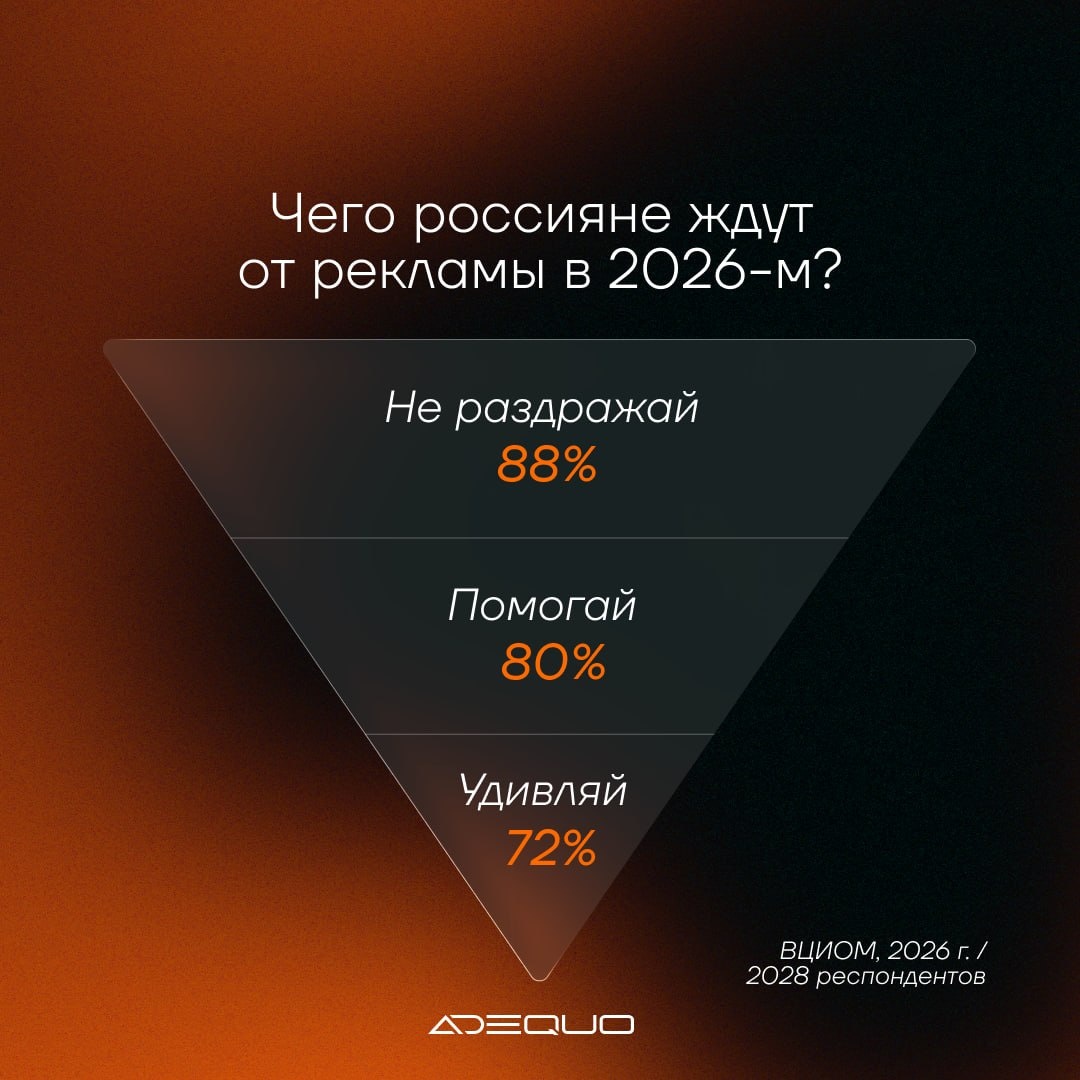 ВЦИОМ опросил 2028 человек, выбрали самое важное из исследования ⬇️ 🙌 Какой должна быть реклама: 88% хотят, чтобы не мешала контенту 80% — чтобы помогала принять решение 72% ценят нешаблонный подход, 70% — юмор и персонализацию 61% хотят видеть реальные истории, а не постановку И только 44% важна возможность купить в один клик — то есть удобство пока проигрывает ненавязчивости. 🙌 Где ищут информацию о товарах: маркетплейсы — 43% поисковики — 34% соцсети и мессенджеры — 28% блогеры — 27% телевизор — 21% 🙌 На что ориентируются при выборе: отзывы реальных покупателей — 72% обзоры блогеров — 39% рекламные объявления и наружка — по 13% 84% после интернет-рекламы продолжают искать товар или запоминают бренд. 🙌 Чего опасаются в рекламе: 58% — информационной перегрузки 50% — что станет сложнее отличить рекламу от контента 49% — что алгоритмы начнут решать за покупателя Общая картина: люди устали от рекламы, которая догоняет и давит. Хотят, чтобы она помогала, не мешала и выгляде