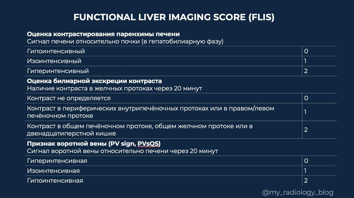 Оценка функции печени остаётся важной задачей в лучевой диагностике, особенно в контексте предоперационного планирования и ведения пациентов с хроническими заболеваниями печени. На фоне развития количественных методов МРТ появился простой и воспроизводимый визуальный инструмент — FLIS (Functional Liver Imaging Score). Что такое FLIS? FLIS — это полуколичественная шкала, основанная на анализе гепатобилиарной фазы. Скоринг включает 3 параметра, каждый оценивается от 0 до 2 баллов: 1. Контрастирование паренхимы печени (относительно почки) 0 — гипоинтенсивная печень 1 — изоинтенсивная 2 — гиперинтенсивная 📌 Отражает способность гепатоцитов к накоплению контраста 2. Билиарная экскреция контраста (через ~20 минут) 0 — отсутствие контраста в желчных протоках 1 — контраст в внутрипечёночных протоках 2 — контраст в общем желчном протоке или двенадцатиперстной кишке 📌 Характеризует экскреторную функцию печени 3. Признак воротной вены (PV sign) 0 — воротная вена гиперинтенсивна 1 — и