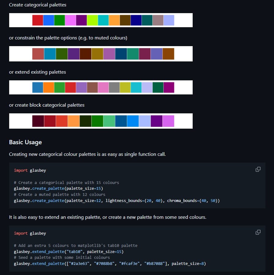 π¨ glasbey β ΡΡΠΎ Python-Π±ΠΈΠ±Π»ΠΈΠΎΡΠ΅ΠΊΠ° Π΄Π»Ρ ΡΠΎΠ·Π΄Π°Π½ΠΈΡ ΠΏΠ°Π»ΠΈΡΡ ΠΈΠ· Ρ ΠΎΡΠΎΡΠΎ ΡΠ°Π·Π»ΠΈΡΠΈΠΌΡΡ ΡΠ²Π΅ΡΠΎΠ², ΠΊΠΎΡΠΎΡΡΠ΅ ΡΠ΄ΠΎΠ±Π½ΠΎ ΠΈΡΠΏΠΎΠ»ΡΠ·ΠΎΠ²Π°ΡΡ Π² Π³ΡΠ°ΡΠΈΠΊΠ°Ρ , Π²ΠΈΠ·ΡΠ°Π»ΠΈΠ·Π°ΡΠΈΡΡ