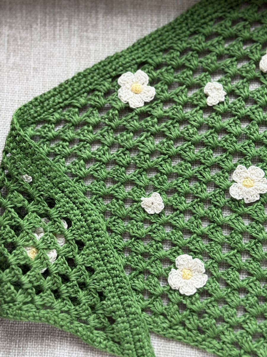 Травянистый цвет косынки напомнил мне земляничную полянку, усеянную цветами. Такой я запомнила её с прошлого мая!