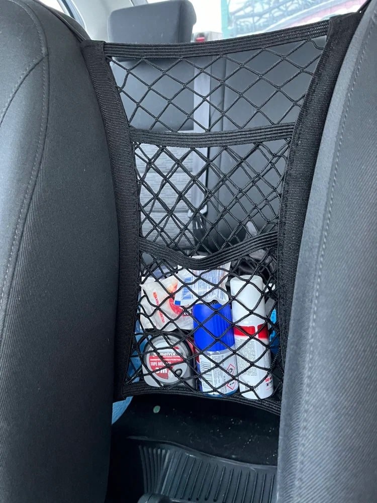 Вожу дочку в школу и на секции. Каждое утро — одна и та же песня: она садится сзади, кладёт планшет на сиденье, а на повороте он летит на пол. Или бутылка с водой закатывается под педали. Я уже устал останавливаться и собирать этот "бардак". Купил эту сетку между сиденьями. Вешается на спинки передних кресел на 4 крюка — держится надёжно, не болтается. Размер 26×30 см, влезает даже в маленькую машину. Два кармана: в один кладём планшет (отлично стоит вертикально), во второй — бутылку и пачку сока. Дочь теперь сама складывает свои вещи, и за 3 недели ни разу ничего не упало. Ещё туда можно положить телефон, ключи, влажные салфетки. Водитель спокоен, ребёнок доволен. А главное — чистота в салоне: не валяется под ногами. Заказывал тут → https://market.yandex.ru/cc/95WMSs