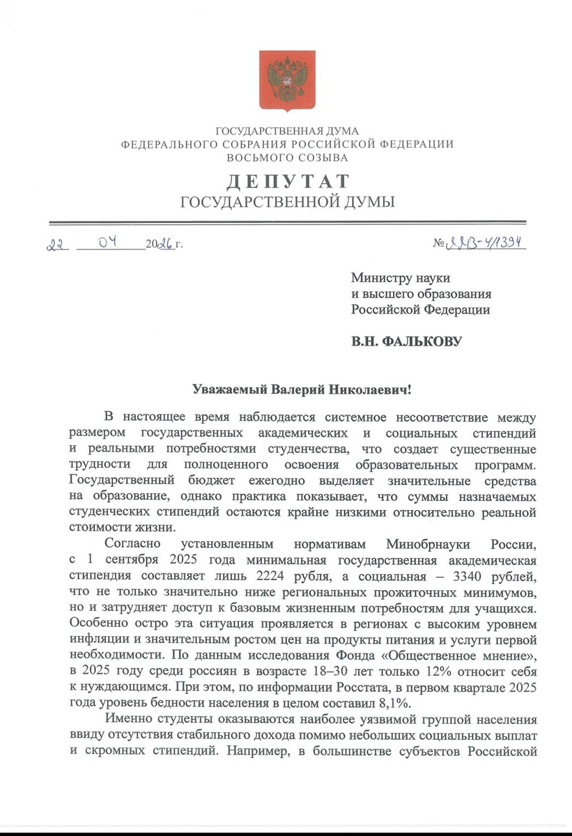 Вместе с лидером нашей фракции Сергеем Мироновым направили обращение главе Минобрнауки Валерию Фалькову с предложением повысить уровень