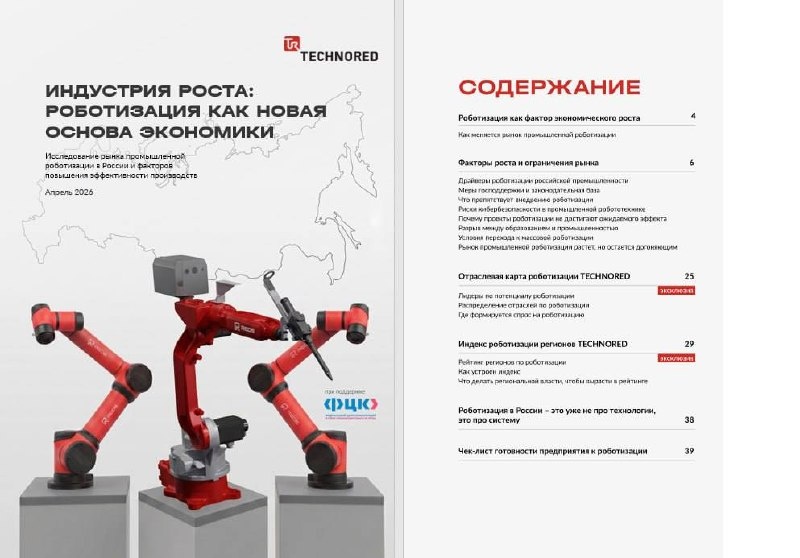 Роботизация в России выходит из стадии отдельных проектов и становится фактором, определяющим развитие промышленности. Компания TECHNORED при поддержке Федерального центра компетенций в сфере производительности труда представила исследование, в котором зафиксированы ключевые изменения в структуре рынка и подходах к внедрению. Ключевой элемент работы — собственная аналитика TECHNORED, которая позволяет посмотреть на рынок глубже стандартной статистики: 💥 Отраслевая карта роботизации TECHNORED — показывает, где на самом деле формируется спрос и какие сегменты будут расти в первую очередь 💥 Индекс роботизации регионов TECHNORED — отражает не только текущий уровень внедрения, но и формирующийся спрос, позволяя увидеть точки будущего роста В отличие от классических обзоров, исследование фиксирует не просто текущее состояние рынка, а его внутреннюю логику: как роботизация распределяется по отраслям и регионам и за счёт чего будет масштабироваться в ближайшие годы. В работе также предст