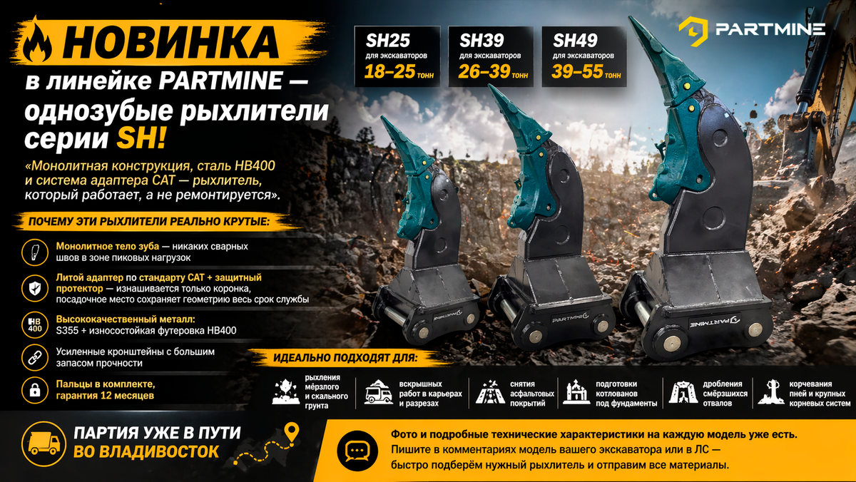 Представляем сразу три модели мощных однозубых рыхлителей: • SH25 — для экскаваторов 18–25 тонн • SH39 — для экскаваторов 26–39 тонн • SH49 — для экскаваторов 39–55 тонн «Монолитная конструкция, сталь HB400 и система адаптера САТ — рыхлитель, который работает, а не ремонтируется». Почему эти рыхлители реально крутые: ✅ Монолитное тело зуба — никаких сварных швов в зоне пиковых нагрузок ✅ Литой адаптер по стандарту CAT + защитный протектор — изнашивается только коронка, посадочное место сохраняет геометрию весь срок службы ✅ Высококачественный металл: S355 + износостойкая футеровка HB400 ✅ Усиленные кронштейны с большим запасом прочности ✅ Пальцы в комплекте, гарантия 12 месяцев Идеально подходят для: — рыхления мёрзлого и скального грунта — вскрышных работ в карьерах и разрезах — снятия асфальтовых покрытий — подготовки котлованов под фундаменты — дробления смёрзшихся отвалов — корчевания пней и крупных корневых систем Партия уже в пути на склады во Владивосток. Пишите в комментари