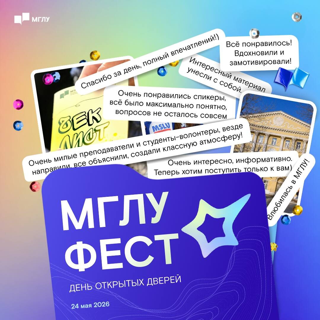 МГЛУ ФЕСТ 24 мая 2026 в МГЛУ пройдёт последний в этом сезоне, уже ставший легендарным, грех-пропустить-какой-информативный, общеуниверситетский день открытых дверей, на котором все-все будут рассказывать всё-всё про поступление и учёбу в Московском инязе 🥺 🗓️ 24 мая 2026 (вс), 11:00 📍 МГЛУ, Москва, Остоженка, 38 🔗 Подробности и регистрация МГЛУ в МАХ | ВК | Дзен